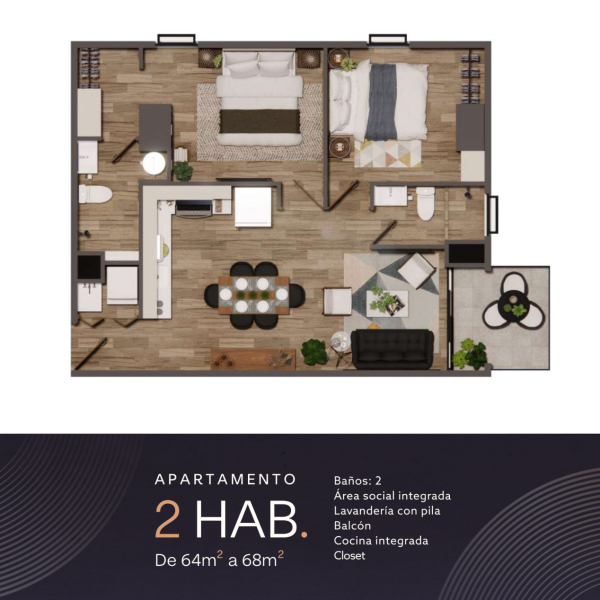2 habitaciones | 61 m² habitables